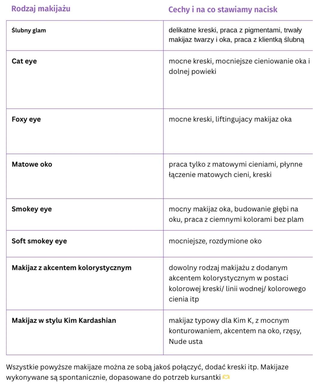 W tabeli zamieściłam rodzaje makijażu, które cieszą się największym zainteresowaniem wśród moich kursantek jednak jeżeli masz sprecyzowane wymagania napisz do mnie i skonsultujmy je wspólnie!